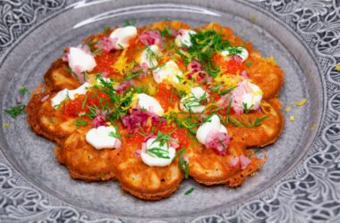 Brunch / Frukost, Matiga våfflor, Nyårets förrätter, Nyårets frukostar / bruncher, Nyårets samtliga recept, Nyårets tilltugg, Recept, Temadagars samtliga recept, Tilltugg med fisk & skaldjur, Tilltugg med ost, Tilltuggens samtliga recept, Våffeldagens samtliga recept Våffelpizza med västerbottensost och forellrom 0 kommentarer