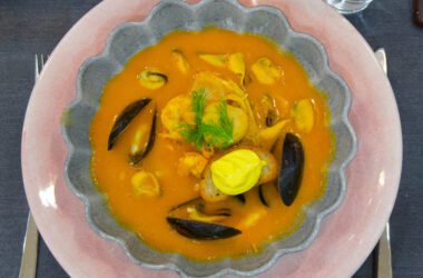 Alla Hjärtans Dags huvudrätter, Alla Hjärtans Dags samtliga recept, Europas samtliga recept, Fisk, Fisk & Skaldjur, Franska huvudrätter, Franskt, Musslor, Räkor, Recept, Seabream, Skaldjur, Soppor, Temadagars samtliga recept Klassisk bouillabaisse med rouille på skivade krutonger 0 kommentarer