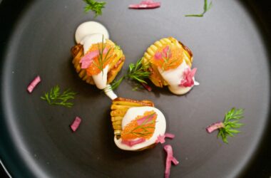 Förrätter, Högtidernas samtliga recept, Nyårets förrätter, Nyårets samtliga recept, Potatisförrätter, Potatisrätter, Recept Mini hasselbackspotatis med vispad crème fraiche, löjrom och syrad rödlök 0 kommentarer