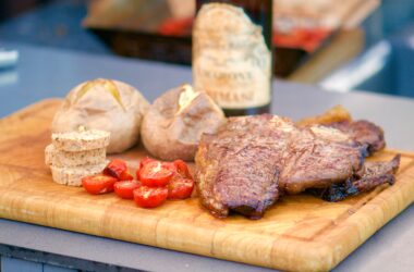 Årstidernas samtliga recept, Grillat, Grillat kött, Kött, Nötkött, Recept, Sommarens huvudrätter, Sommarens samtliga recept Grillad t-benstek med bakpotatis, grillade cocktail tomater och svartpepparsmör med steak sauce 0 kommentarer