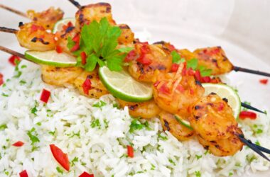 Årstidernas samtliga recept, Grillad fisk / skaldjur, Grillat, Grillspett, Räkor, Recept, Skaldjur, Sommarens huvudrätter, Sommarens samtliga recept, ViktVäktarnas samtliga recept, VV skaldjur Grillade apelsin- och chiliräkor med limeris 0 kommentarer