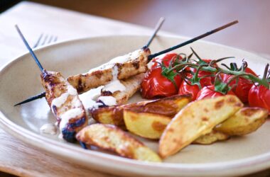 Fläskkött, Grillat, Grillat kött, Grillspett, Kött, Recept, ViktVäktarnas samtliga recept, VV kött Fläskkotlettspett med vitt bbq-sås och klyftpotatis 0 kommentarer