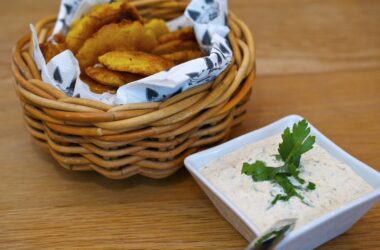 Förrätter, Karibiens förrätter, Karibiens samtliga recept, Karibiens tilltugg, Recept, Tilltugg vegetariska, Tilltuggens samtliga recept, Vegetariskt Dubbelfriterade matbananschips med karibisk dipsås 0 kommentarer